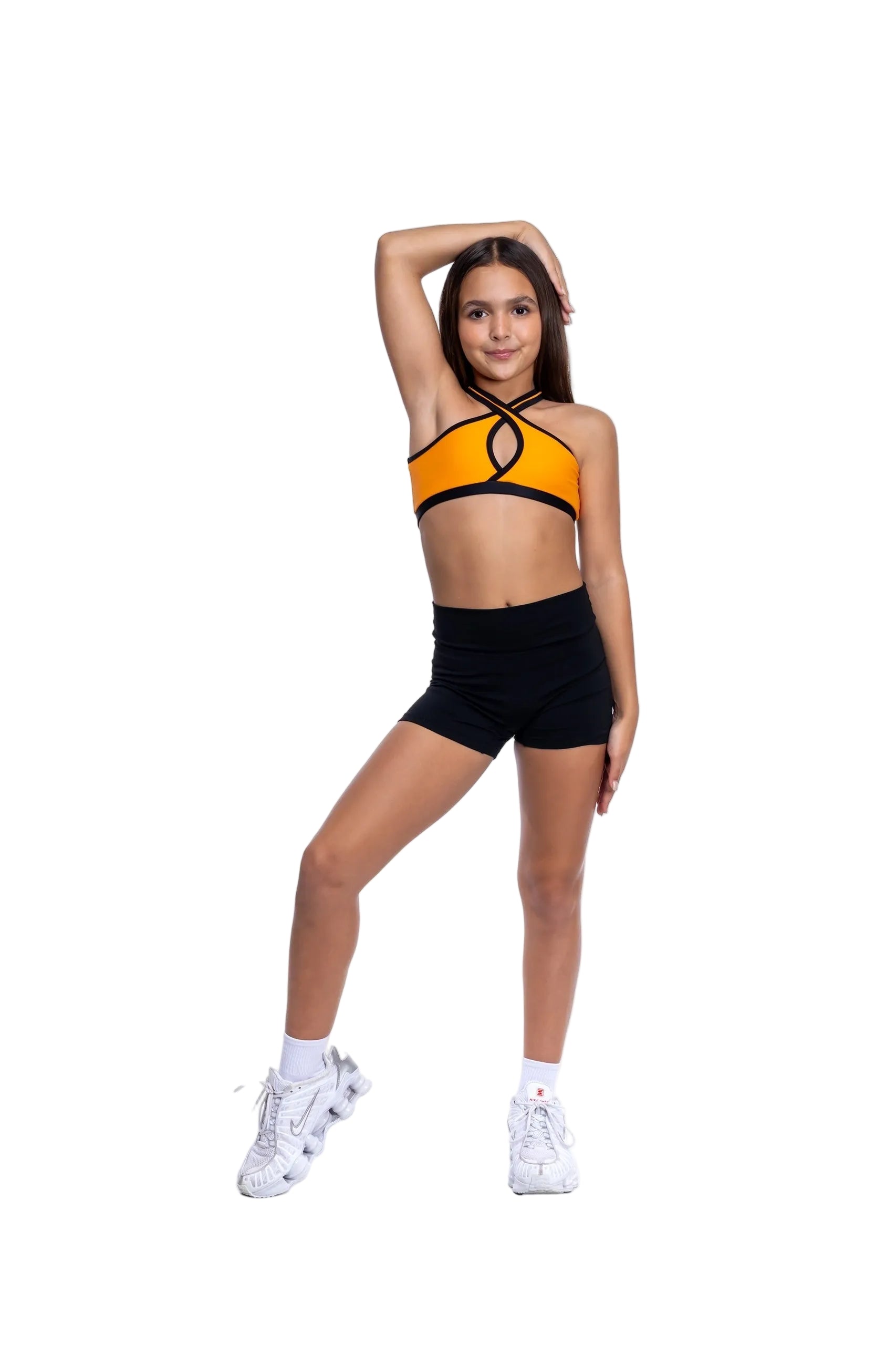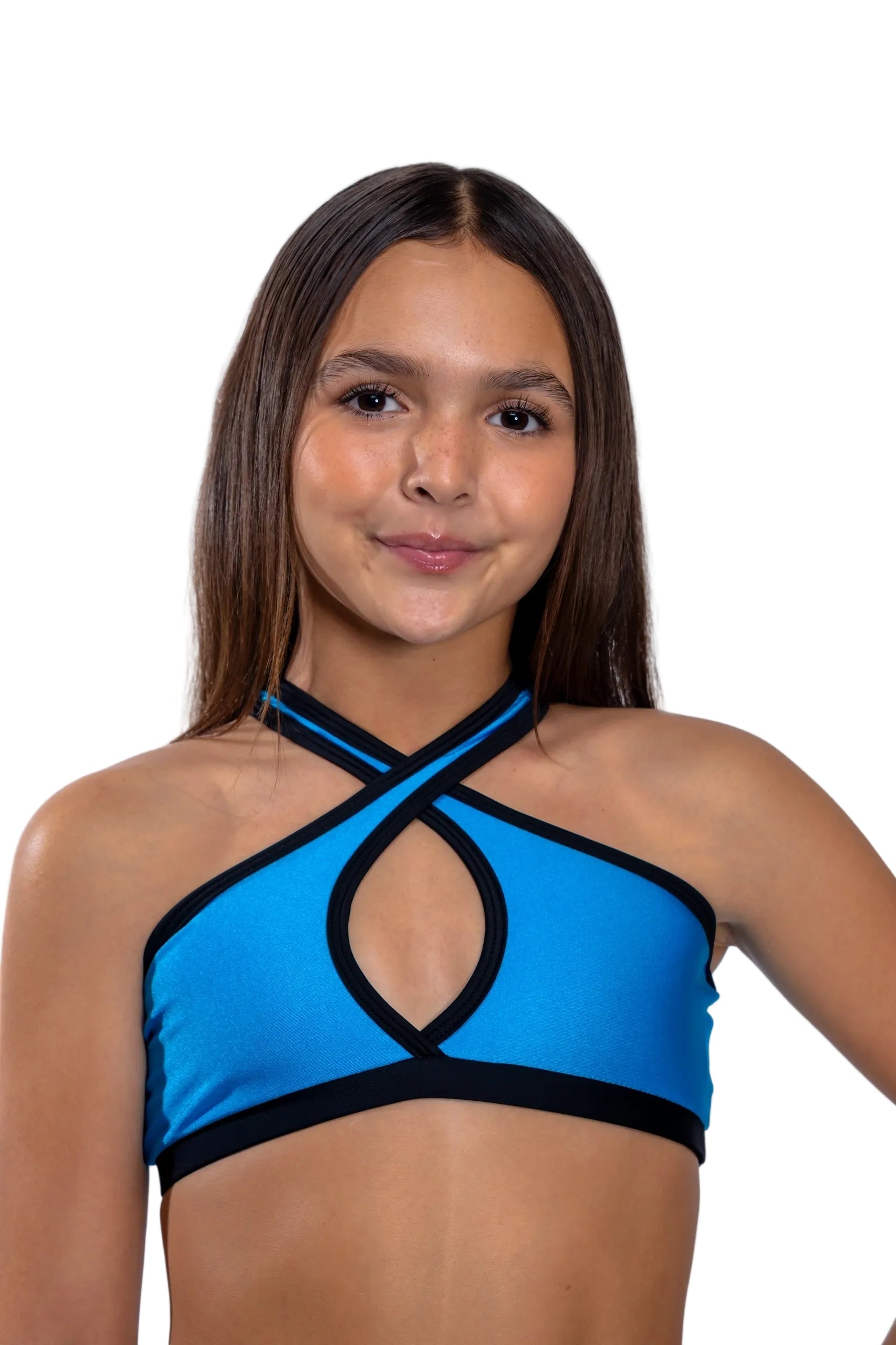 The Radiant Crop brings the wow factor with its bold crossover neck design and vibrant colors. Perfect for dancers who want to make a statement, this crop is sure to turn heads and keep you shining through every performance.