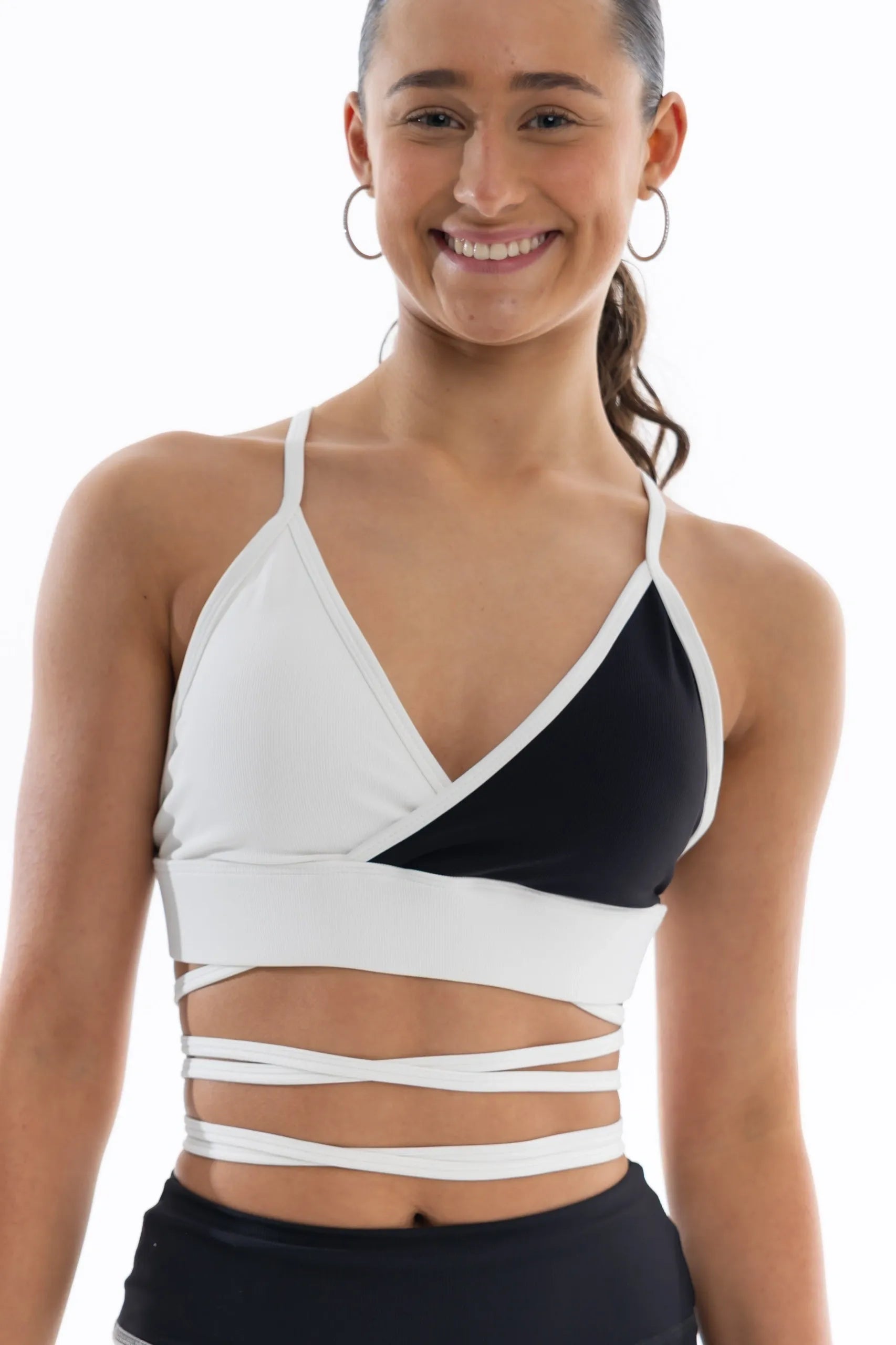 A bold black-and-white design with adjustable straps that tie around the stomach, offering a customizable fit. Pair it with matching shorts for a complete look. Perfect for dance, workouts, or adding a stylish edge to your activewear collection. Move freely while making a statement.